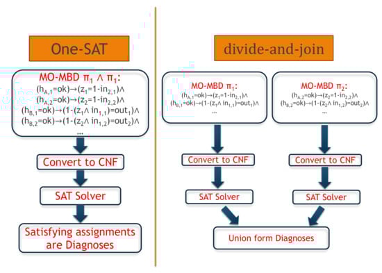 - Metodi, A.; Stern, R.; Kalech, M.; Codish, M. A novel SAT-based approach to model based diagnosis. J. Artif. Intell. Res. (JAIR) 2014, 51, 377–411. [Google Scholar] [CrossRef]