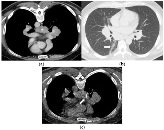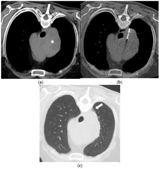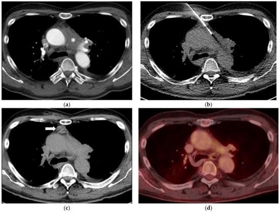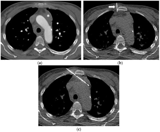 - Na Lee, H.; Yun, S.J.; Kim, J.I.; Ryu, C.-W. Diagnostic outcome and safety of CT-guided core needle biopsy for mediastinal masses: a systematic review and meta-analysis. Eur. Radiol. 2019, 30, 588–599. [Google Scholar] [CrossRef] [PubMed]