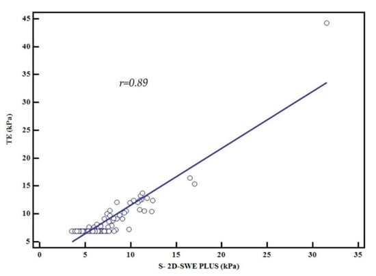 Relationship between the mean values assessed by TE and 2D-SWE.PLUS, Pearson’s correlation coefficient, r = 0.89.