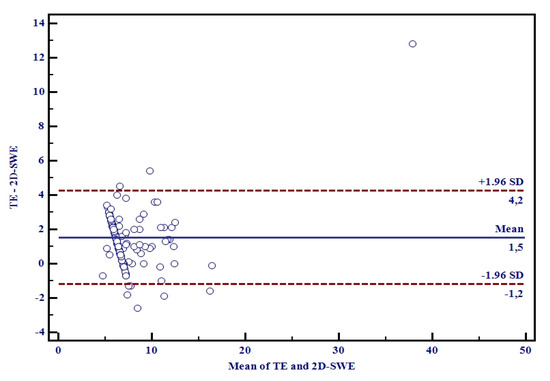 An excellent correlation was obtained between LSMs by 2D-SWE.PLUS and TE (r = 0.89, R2 = 0.79, p < 0.0001), meaning that 80% of the TE LSM values can be explained by 2D-SWE.PLUS LSM values (Figure 3). The Bland–Altman analysis showed that the mean difference in LSMs between 2D-SWE.PLUS and TE was 1.5 ± 0.35 kPa. The 95% upper and lower limits of agreement (LOA) were 4.2 and −1.2 kPa, respectively (Figure 4).