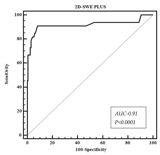 A comparative study that included 291 patients with NAFLD, who underwent LSM using p-SWE from Siemens, 2D-SWE from SSI and TE as compared to liver biopsy was published by Cassinotto et al. (2016) [38]. The AUROC for 2D SWE from SSI was 0.89 for diagnosing significant fibrosis (F ≥ 2) with similar cut-off values to TE for predicting significant fibrosis: 6.3 vs. 6.2 kPa. Herrmann et al. (2018) published a meta-analysis based on individual patients’ data, which evaluated 2D-SWE (SSI) using liver biopsy as reference; 2D-SWE (SSI) showed a good performance in fibrosis assessment in NAFLD patients with an AUROC of 0.85 for diagnosing significant fibrosis (F ≥ 2) and of 0.95 for diagnosing cirrhosis [20]. The best cut-off for diagnosing F ≥ 2 was 7.1 kPa. Similar results were presented in other three meta-analyses [42,43,44]. In this study, the calculated 2D-SWE.PLUS cut-off value for significant fibrosis (F ≥ 2), using TE as the reference method, was 7 kPa.