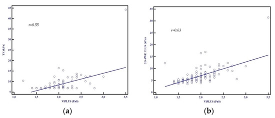 A good correlation between Vi.PLUS measurements and LSM by TE (r = 0.55, p < 0.001) and by 2D-SWE.SSI (r = 0.63, p < 0.001) was found (Figure 6a,b).