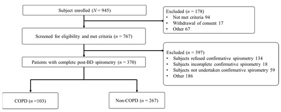 The Taiwan Society of Pulmonary and Critical Care Medicine recruited participants and implemented a study, commissioned by the Taiwan Ministry of Health and Welfare, on early diagnosis of COPD. The eligibility criteria were as follows: having an age of ≥40 years, having ≥10 pack-years of smoking, exhibiting chronic respiratory symptoms (cough, phlegm, or dyspnea, or combination thereof), and not having a confirmed COPD diagnosis within the prior year. We excluded individuals who did not undergo post-BD spirometry because we could not confirm whether a given individual had a COPD diagnosis; we also excluded those who were unable to correctly operate the Spirobank Smart device. Accordingly, a total of 370 participants completed all the tests, and their data were analyzed in this study. A flowchart of the participant enrollment procedure is presented in Figure 1.