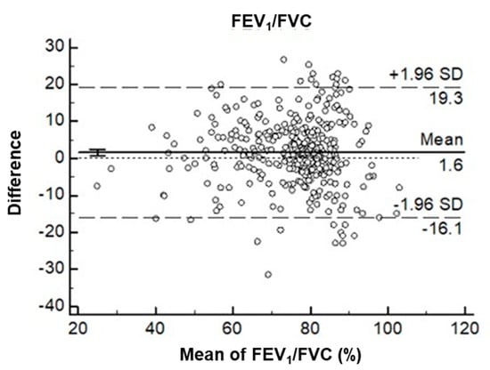 Bland–Altman plots (Figure 2) are useful for determining the relationship between differences and averages, which can help researchers to explore any systematic biases and identify possible outliers. In this study, we derived Bland–Altman plots to evaluate the agreement between the pre-BD FEV1/FVC ratios measured using Spirobank Smart and the post-BD FEV1/FVC ratios measured using the confirmatory spirometry. The plots revealed that few values (5.67%) fell outside the 95% confidence interval. The mean difference between the post-BD values derived using the confirmatory spirometry and the FEV1/FVC values derived using Spirobank Smart was 1.6%. Additionally, the plots demonstrated that the limits of agreement were superior (narrower) for the mean of FEV1/FVC values of <70% than they were for the mean of FEV1/FVC values of ≥70%.