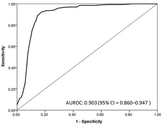 We constructed ROC curves (Figure 3) to assess the suitability of FEV1/FVC measured using Spirobank Smart as a prescreening measure for COPD identification. Our results indicated that FEV1/FVC measured by Spirobank Smart could significantly predict COPD, with the corresponding area under the ROC curve (AUROC) being 0.903 (95% CI = 0.860–0.947). According to the Youden index derived from our ROC analysis, Spirobank-Smart-measured FEV1/FVC values of < 74% can serve as high-risk indicators of COPD, and the highest predictive ability was observed at an AUROC value of 0.873 (95% CI = 0.827–0.920).
