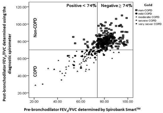 The conventional GOLD definition may lead to the underdiagnosis of obstruction in younger adults and overdiagnosis of obstruction in older adults [33,34]. Therefore, scholars have suggested the use of a lower limit of normal (LLN)-based diagnosis of COPD [33,34,35]. However, a previous study reported that LLN-based definitions tend to underdiagnose COPD in symptomatic patients [4]. In our study design, we used a case-finding strategy based on symptom screening. The conventional GOLD definition may, therefore, be the appropriate choice for reducing the underdiagnosis of COPD in our screening strategy. In addition, previous studies have indicated that the LLN-based diagnosis of COPD generated fewer false positives and more false negatives compared with the conventional GOLD definition. False negatives lead to the undertreatment of patients with COPD during disease stages (e.g., GOLD I and II) when they are likely to benefit most. Moreover, LLN tends to categorize elderly adults with mild obstruction into a non-COPD category (due to its high specificity and low sensitivity) [36]. In our study population, the mean age was 60.9 years, and a large proportion of the participants had COPD in GOLD I and II; thus, the use of the conventional GOLD definition may help to avoid potential false-negative results. A previous study revealed that compared with diagnoses executed using fixed cutoff values, diagnoses based on the LLN involved slightly higher NPVs [37]. Considering the potential false positives that can result from using the conventional GOLD definition and considering the evolving understanding of strategies for airflow obstruction detection, the use of the LLN-based definitions as a gold standard in spirometry to validate the FEV1/FVC values that were determined using Spirobank Smart could be valuable and warrants further study.