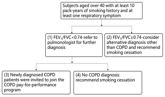 A CAT score of ≥10 points is used to classify patients with COPD as highly symptomatic. In the present study, 41.7% of patients that were newly diagnosed as having COPD had CAT scores of <10, which indicated that the presence of fewer symptoms may contribute to diagnostic confusion and clinical neglect. Moreover, studies have reported that handheld spirometers are useful for determining obstruction severity. In our study, we assessed the feasibility of evaluating COPD severity in an at-risk population by using FEV1. We determined that nearly 70% of the newly diagnosed COPD cases were classified as GOLD I or II based on the FEV1 values that were measured using Spirobank Smart. The frequency of GOLD classifications was similar to that of the diagnostic spirometer. Our findings also demonstrate that the prevalence of COPD in GOLD I was 24.3%, which is similar to that (27.2%) observed in a previous study conducted at a single medical center in Taiwan [23]; this suggests that Spirobank Smart is useful for identifying undiagnosed COPD with mild or moderate airway limitations in at-risk populations and can help to raise awareness of current perceptions of COPD. Based on our study findings, to provide the appropriate intervention, we propose the following clinical procedure for the triage of participants who are at risk of COPD: (1) if the FEV1/FVC ratio is <0.74, the patient should be referred to a pulmonologist for further diagnosis; (2) if the FEV1/FVC ratio is ≥0.74, a diagnosis alternative to COPD should be considered, and smoking cessation should be recommended to the patient; (3) if a patient is newly diagnosed as having COPD, they should be invited to join the COPD pay-for-performance program that is implemented by the National Health Insurance Administration to encourage physicians to provide patient-centered care plans; (4) if an individual is diagnosed as not having COPD, they should be advised to cease smoking (Figure 5). Furthermore, our findings indicated that patients with known smoking history who are old age had a higher risk of COPD. The English Longitudinal Study of Ageing (ELSA) demonstrated that nearly all smoking-related deaths (99%) were due to the occurrence of COPD in people aged >50 years, and the mean duration of smoking for current smokers was 42 years [38]. These findings suggest that an age of >40 years and a smoking history of ≥10 pack-years are adequate criteria for early COPD detection. In our study, we believe that symptomatic individuals who are aged >60 years with smoking history have greater risk of COPD and deserve closely routine COPD screening.