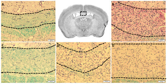 Demyelination assessment was performed after fixing using Luxol fast blue-periodic acid Schiff-staining (LFB-PAS) on 5 μm thick coronal slices through the anterior, mid, and posterior CC. CC myelinated axons were scored on a scale of 0 to 3. A score of 3 for a fully myelinated (blue axonal fibers) CC down to 0 for complete demyelination (pink axonal fibers). LFB-PAS sections were scored blinded, sections were averaged, and differences among the groups compared to untreated mice.