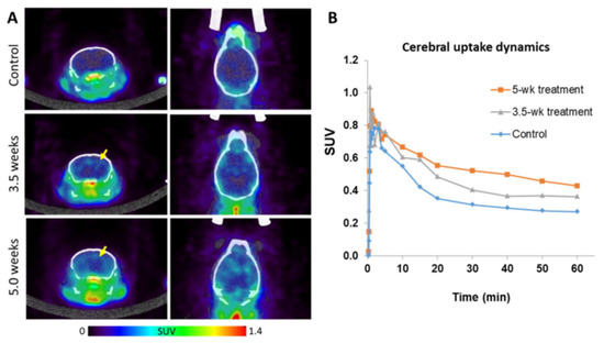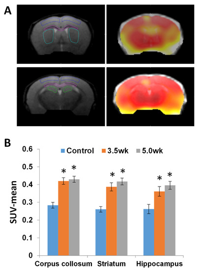 For analysis, MRI and PET/CT images from the same animal were registered manually using VivoQuant software. Regions of interest (ROIs) were manually drawn around the CC, hippocampus (H), and striatum (caudate/internal capsule, S) using T2-weighted MR images and then overlaid to the corresponding PET images. Mean SUVs were obtained from these ROIs to form time activity curves in dynamic PET data or report uptake levels at 40 min post injection in static PET data.