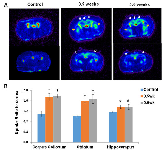 14], in the CIM, our AR uptake appears to be more robust. This could be related to an additional week of cuprizone intoxication (6 weeks in their study). Our study also revealed significant uptake at 3.5 weeks in the CC, H, and S. Future comparison of the two markers may be useful. We also demonstrated increased AR uptake of