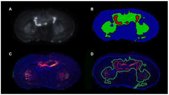 Mouse brains were collected, snap-frozen in liquid nitrogen post sacrifice, and coronally cryosectioned to obtain CC, S, and H sections for autoradiography (AR), and for IF staining. AR sections were exposed to a storage phosphor screen overnight and scanned using a digital storage phosphor imaging system (Cyclone Plus, PerkinElmer Inc., Shelton, CT, USA). Sections for IF staining were fixed in 4% formalin at room temperature for 10 min and stored in a −80 °C freezer for further staining.