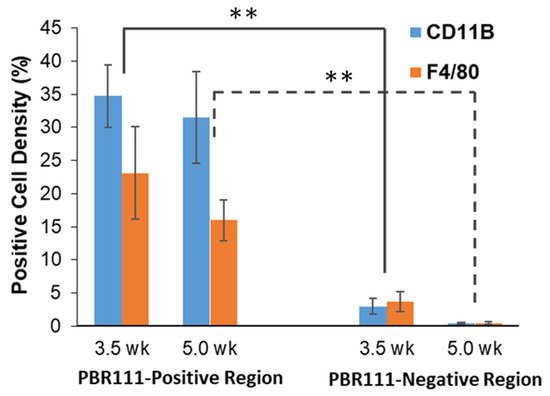 18F-PBR-111 negative uptake region for the 3.5 week CF group, and (31.5 ± 6.9) % vs. (0.4 ± 0.1) % for the 5.0 week CF group. The cell density of positive F4/80 staining was less than the positive cell density of the CD11b-staining. There were no statistically significant differences in both CD11b and F4/80 staining between 3.5 weeks and 5.0 weeks, which corroborated with PET and AR images.