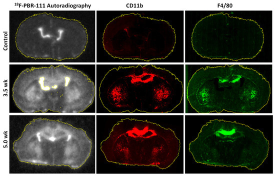 18F-PBR-111 and positive staining of CD11b and F4/80 is visible. Quantification from the immunostaining analysis is displayed in