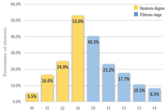 Proportion of patients according to steatosis degrees and fibrosis stages.