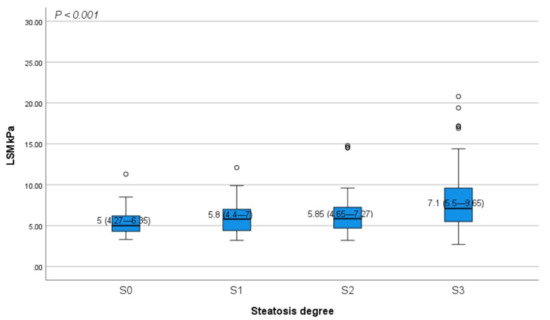 Distribution of LSM values according to steatosis degrees. The bottom and the top of each box represent the 25th and 75th percentiles, while the lines through the box indicate the median. The error bars indicate the 10th and 90th percentiles, excluding outliers (black circles). LSM, liver stiffness measurement.