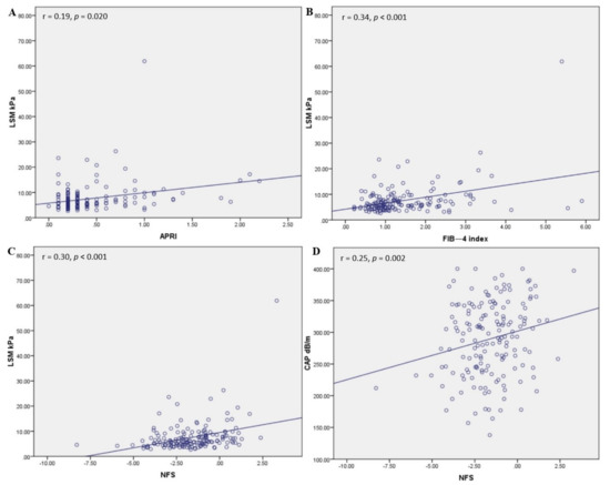 For the overall cohort we found a significant correlation between LSM values and APRI (r = 0.19, p = 0.020) (Figure 3A), FIB-4 index (r = 0.34, p < 0.001) (Figure 3B), and NFS (r = 0.30 p < 0.001) (Figure 3C). Regarding hepatic steatosis expressed by CAP score, only NFS (r = 0.25, p = 0.002) maintained a positive, significant correlation (Figure 3D), while APRI (r = 0.11, p = 0.181) and FIB-4 (r = 0.07, p = 0.399) did not.