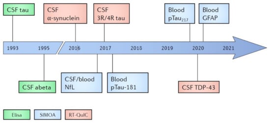 In the last few years, however, ground-breaking new approaches on biomarker-based diagnostics of neurodegenerative dementias have been introduced (see Figure 1). In this review, we have presented these novel molecules based on the most promising methods for diagnostics, i.e., SIMOA and RT-QuIC (see Table 1).