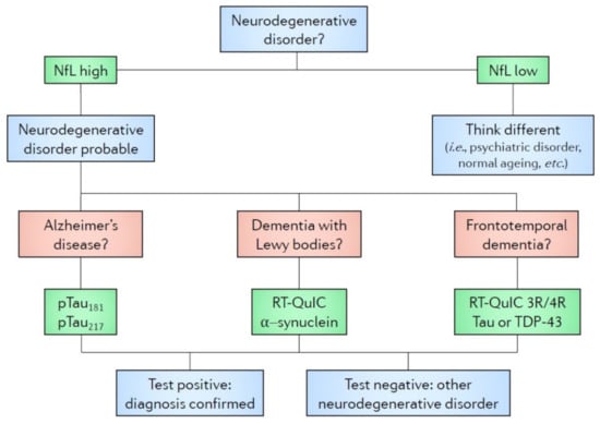 We suggest that a systematic utilization of a diagnostic algorithm would enhance the accuracy of clinical trials and could be employed also in the routine clinical work. Therefore, we propose a two-step fluid biomarker-based algorithm (see Figure 2). First, the presence or absence of an ongoing neurodegenerative disorder should be proven. Blood NfL may be considered as a candidate biomarker at this stage. The second step is the differential diagnosis between neurodegenerative disorders, in which the best candidate biomarker should be chosen based on the clinical assessment.