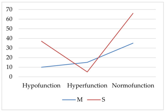 AIT patients with hypofunction or normal thyroid function had severe acne (S) more frequently (p < 0.001, p = 0.002, Chi-square). Patients with thyroid hyperfunction more frequently had statistically significantly moderate acne (M; p = 0.025, Chi-square; Figure 1).