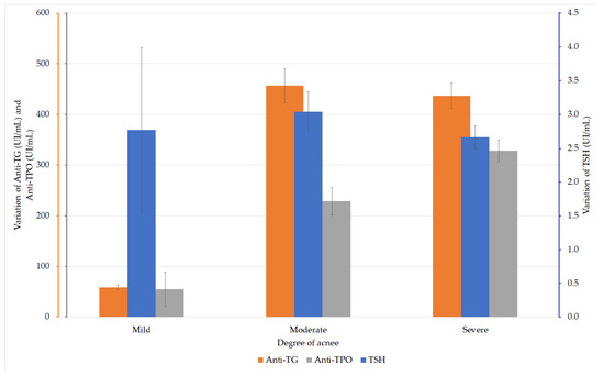 Anti-TG values did not significantly influence the severity of acne, while anti-TPO values were significantly higher in patients with severe acne.