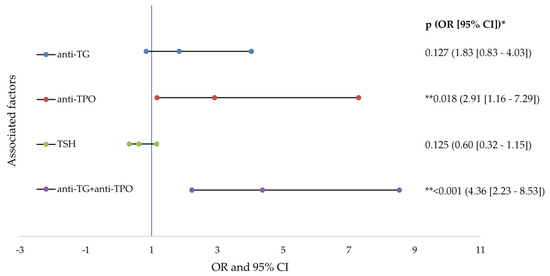Forest plots of factors associated factors with severe acne (logistic regresion analysis). anti-TG—antithyroglobulin antibody; anti-TPO—thyroid peroxidase antibodies; TSH—thyroid stimulating hormone; OR—odd ratio; CI—confidence interval; p value—statistical significance; * logistic regression analysis; ** p values < 0.05.
