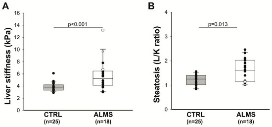 LS was significantly higher in the patients than in the controls (mean values: 5.3 (range: 4.1–6.5) versus 3.7 (range: 3.3–4.2); p < 0.001, Figure 1A), also excluding the three patients with signs of portal hypertension (IDs 1, 2, and 5, described in Table 2 and Table 3 and indicated by white symbols, (mean: 4.8 (range: 4–6.2) versus 3.7 (range: 3.3–4.2); p = 0.002). Patients with ALMS displayed L/K values higher than controls (mean: 1.6 (range: 1.2–2) versus 1.3 (range: 1–1.4); p = 0.013) (Figure 1B).