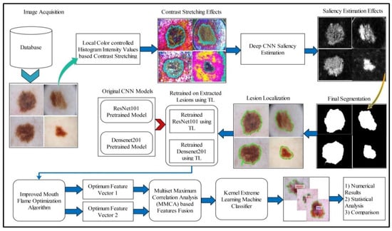 In brief, the discussed techniques are mostly based on pre-trained CNN models for feature extraction. Additionally, they used CNN segmentation models for lesion detection. As mentioned earlier, the studies’ primary focus was to improve the accuracy of a system; however, they did not focus on the system’s prediction time. In this work, we select the optimal deep features and combine features based on the correlation-related fusion approach. Most of the above-discussed articles used the SVM for the final classification stage, but our target is a multiclass learner, and therefore, we utilized the Kernel Extreme Learning Machine (KELM).