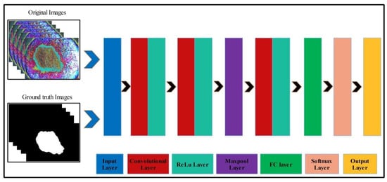 Mathematically, this approach is formulated as follows: Given that denotes output enhanced images with dimensions of , we utilized these images to design a simple CNN model. The main use of this model is to learn and visualize the features of an image. Visually, the designed model is shown in Figure 7. This model includes several layers, such as one input layer, three convolutional layers along with the ReLu layer, one max-pool layer, one fully connected layer (FC), one softmax layer, and, finally, an output layer. The size of the input layer was ; therefore, we resized all images to this size. In the first convolutional layer, the filter size was , the number of channels was 3, the filter size was 64, and stride was . After this layer, we obtained two feature matrices named the weight matrix and the bias matrix. The size of the weight matrix was and the bias matrix was .