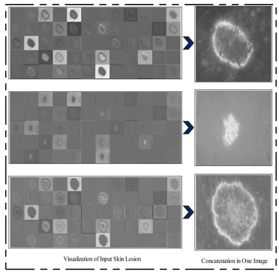 After training, the features of the third convolutional layer were visualized, and in the output, 96 images were generated, as shown in Figure 8. Then, all 96 output images were combined in one image to obtain a saliency map image. Visually, this resultant image is shown in Figure 8. This figure shows that the output image is more informative, and the lesion is highlighted. By utilizing this saliency map image, superpixels were computed and the pixels were reconstructed. The main purpose of the superpixel technique is to group the important image pixels of a meaningful object. The second purpose of this approach is to remove image complexity. In this work, we used a simple linear iterative clustering approach [] for superpixel generation. This approach is shown in Figure 9. This figure illustrates that initially, superpixels are generated, and then, they are combined based on color pixels.