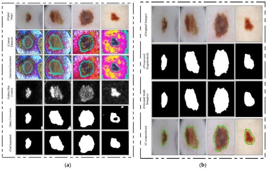 Proposed skin lesion segmentation results. (a) Intermediate segmentation results, (b) segmentation results compared with ground truth images.