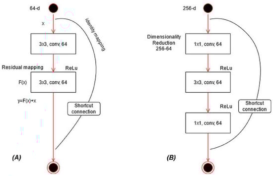 ResNet101 CNN Model: ResNet was proposed in 2015 []; see Figure 11A. In this model, a few connections are simply skipped, and the direct connections are made between the layers. In ResNet101, the “bottleneck” building blocks are used to reduce the parameters (see Figure 11B). These blocks are formulated as follows: