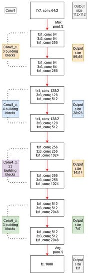 where represents a convolutional operation, which is utilized to adjust the input dimensions. Visually, the architecture of ResNet101 is shown in Figure 12. The network incorporates five convolutional blocks: Conv1, represents the first convolutional layer; Conv2 includes three building blocks, and each block has three convolutional layers. The third convolutional layer includes four building blocks. In the fourth and fifth convolutional layers, there are 23 and 3 building blocks, respectively. Finally, the last layer is the FC layer used for classification.