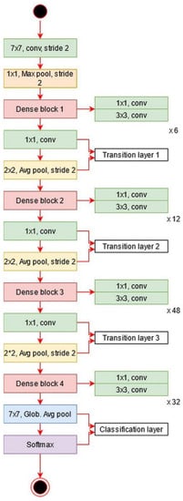 The architecture of DesnseNet201 is illustrated in Figure 13. This figure describes that the first convolutional layer has a filter size of and stride of . After this layer, a max-pooling layer is added of a filter size of . Afterward, a dense block is added and each dense block includes a convolutional layer of filter size and . The main purpose of adding this convolutional layer is to reduce the feature map and decrease the computational cost. A total of four dense blocks have been added to this architecture, and for each dense block, convolutional bocks are added. The size of the convolutional blocks is 6, 12, 48, and 32, respectively. After each dense block, a transition layer has been added. After the fourth dense block, a global average pooling layer has been added of a filter size of followed by an FC layer for final classification.