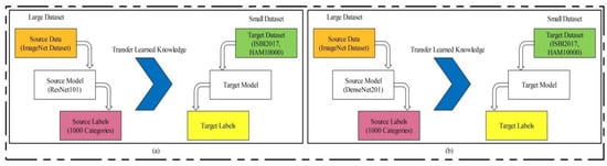 Transfer Learning-based model training: Transfer learning (TL) is a technique where an existing pre-trained model is reused for a new classification task []. TL has been proven to achieve good performance on many image classification tasks [,,,]. Visually, this process is illustrated in Figure 14, where the pre-trained models are trained on large datasets such as ResNet101 and DenseNet201 in this work. In TL, knowledge is transferred on a target model, and the target datasets used were ISBI 2017 and HAM10000. After reusing both models, two new models were obtained for the classification of multiclass skin lesions. In the TL phase, we selected 70% images for training the model and the remaining 30% were used for testing. The number of epochs was 20 and the learning rate was 0.0001. The mini-batch size was set as 64. Mathematically, we can define TL as follows.