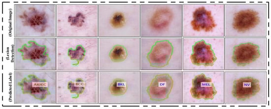Several skin lesion segmentation and classification techniques exist in the literature—using either conventional or deep methods. For example, Khan et al. [] presented a novel technique based on probabilistic distribution and feature selection for skin lesion detection and classification. Normal and uniform distributions are implemented to segment the lesion area. Later, the features are extracted from the segmented images, which are finally fused using a parallel fusion strategy. For feature selection, the entropy-based technique is combined with Bhattacharyya distance and variance formulation. The proposed technique is evaluated on three publicly available datasets, including combined ISBI 2016 and ISBI 2017, ISIC, and PH2, achieving an accuracy of 93.2%, 97.75%, and 97.5%, respectively.