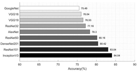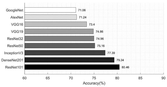 Lastly, we also compared the performance of different neural networks to analyze the selection of ResNet101 and DenseNet201. Figure 18 shows the classification performance of various neural networks for the HAM10000 dataset. Neural networks such as VGG16, VGG19, AlexNet, GoogleNet, ResNet32, ResNet50, ResNet101, Inception V3, and DenseNet201 achieved an accuracy of 73.4%, 74.86%, 71.24%, 71.06%, 74.96%, 75.16%, 80.46%, 77.39%, and 79.34%, respectively. These networks were trained on extracted skin lesion types and the results were computed without any feature optimization.