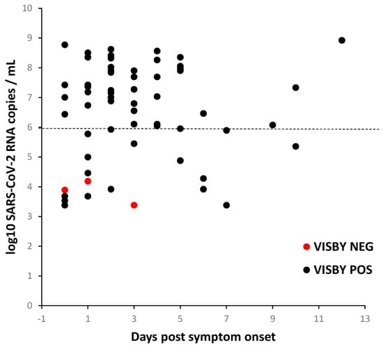 Detection of SARS-CoV-2 by Visby device based on viral loads and the time of symptom onset. SARS-CoV-2 viral loads by the time of symptom onset for the symptomatic and RT-qPCR positive individuals. Black and red dots represent positive or negative Visby results, respectively. Dotted line: 6 log10 SARS-CoV-2 RNA copies/mL shows the VL threshold limit determining the number of culturable viruses. Note: Samples classified at day 0 include 4 samples with unknown dates of symptoms.