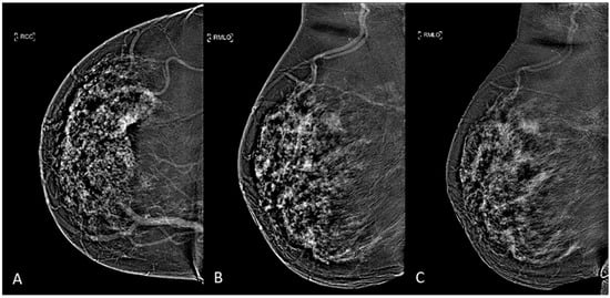 CEM subtracted images of a multifocal IDC in a 53-years-old woman with dense breast: (A) CC view, (B) early-MLO view, (C) late-MLO view.