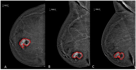The margins of the breast lesions were defined on dual-energy subtracted (DES) images, where contrast uptake was emphasized, both in CC and in early and late MLO view. An example is shown in Figure 2.
