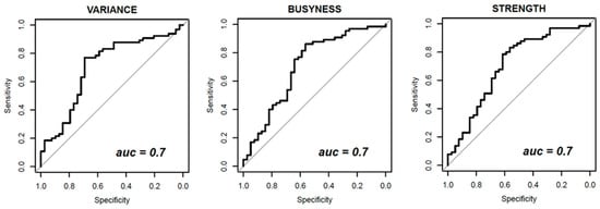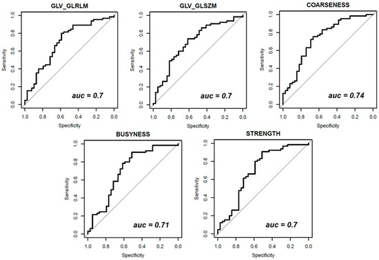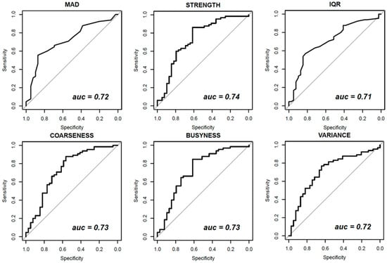 Figure 3, Figure 4 and Figure 5 show ROC curves trend of significant textural features: MAD, IQR, VARIANCE, COARSNESS, BUSYNESS, and STRENGHT for CC projection, VARIANCE, BUSYNESS and STRENGHT for early-MLO projection and GLV_RLRLM, GLV_GLSZM, COARSNESS, BUSYNESS, and STRENGHT for late-MLO projection.