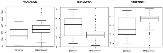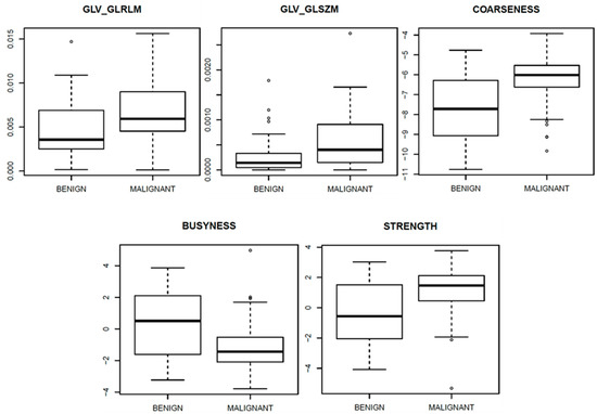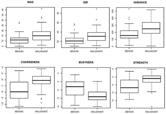 Figure 6, Figure 7 and Figure 8 show the boxplots, related to above-mentioned parameters, to separate benign from malignant lesions.