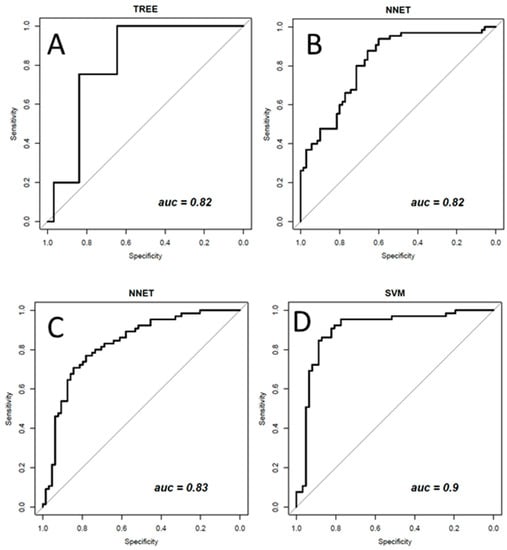 ROC curve of the best classifier in (A) a TREE using a subset of three robust textural features extracted by CC view; in (B) a NNET using a subset of ten robust textural features extracted by early-MLO view; in (C) an NNET using a subset of eleven robust textural features extracted by late-MLO view; in (D) a SVM using the all-balanced textural features set extracted from all three mammographic projections (CC, early MLO, and late MLO).