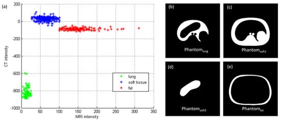 (a) Pointwise intensity pairs and phantom image segmented into (b) lung, (c) low-intensity soft tissue, (d) high-intensity soft tissue, and (e) fat.