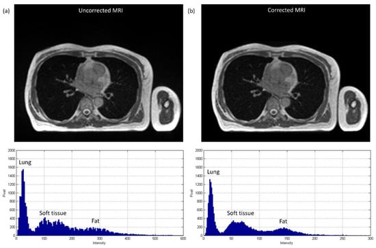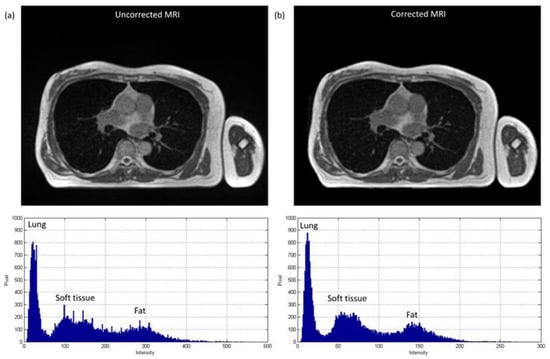 Axial image and histogram of (a) uncorrected MRI (WL/WW = 200/400) and (b) corrected MRI (WL/WW = 100/200) from 0.35 T scanner for chest imaging used to generate CNN validation dataset ().