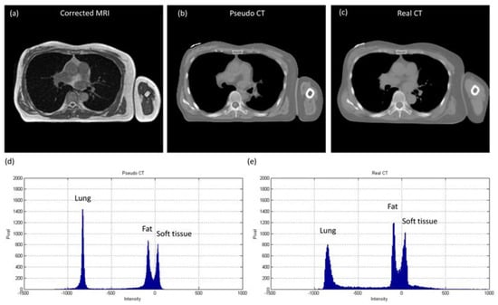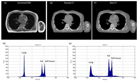 (a) Corrected MRI from 0.35 T scanner (WL/WW = 100/200), (b) pseudo-CT (WL/WW = 0/1000), (c) real CT (WL/WW = 0/1000), (d) histogram of pseudo-CT, and (e) histogram of real CT for chest imaging used to generate CNN validation dataset ().