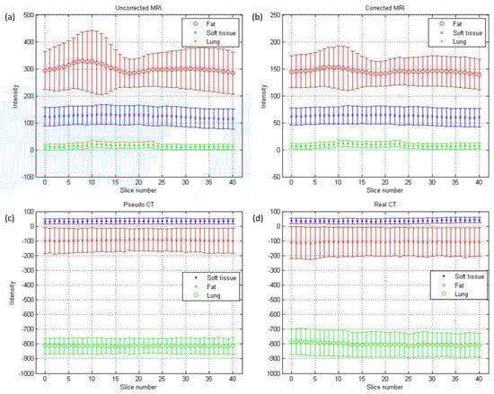 Mean (central line) and standard deviation (error bar) of chest imaging for cancer treatment: (a) uncorrected MRI, (b) corrected MRI, (c) pseudo-CT, and (d) real CT.