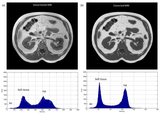Axial image and histogram of (a) uncorrected MRI (WL/WW = 375/750) and (b) corrected MRI (WL/WW = 125/250) from 1.5 T scanner for abdominal imaging belonging to CNN testing dataset ().