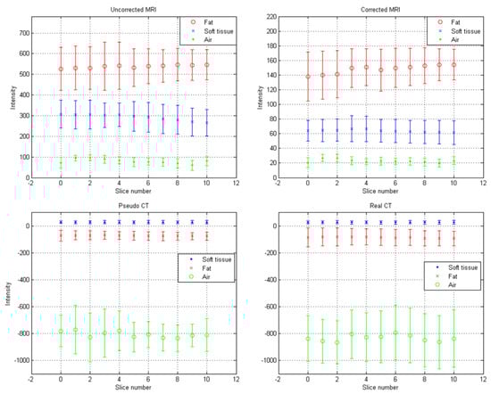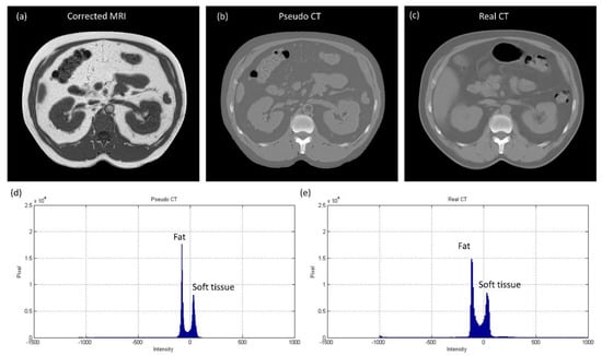 Figure 10 shows the axial images and histograms of MRI acquired with the 1.5 T scanner before and after intensity normalization for abdominal imaging belonging to the CNN testing dataset (). For , the axial image of corrected MRI acquired with the 1.5 T scanner, its pseudo-CT, and real CT acquired with 64-detector row CT are demonstrated in Figure 11a–c, while the histogram of Figure 11b,c is shown in Figure 11d,e respectively. Figure 12 summarizes the mean and standard deviation of image intensity of three different tissue types for uncorrected MRI, corrected MRI, pseudo-CT, and real CT covering 11 slices. As seen in Figure 12, fat tissue is still the component showing the most serious MRI intensity inhomogeneity, but its impact on pseudo-CT synthesis was eased after MRI intensity normalization. The mean value ± standard deviation of fat tissue in MRI was 533 ± 91 (CV = 17.07%) before correction and 148 ± 28 (CV = 18.92%) after correction. The mean value ± standard deviation of fat tissue in pseudo-CT was −72 ± 32 HU (CV = 44.44%) and −86 ± 63 HU (CV = 73.26%) in real CT. With regards to soft tissue, the mean value ± standard deviation was 298 ± 68 (CV = 22.82%) in MRI before correction, 65 ± 17 (CV = 26.15%) in MRI after correction, 29 ± 11 HU (CV = 37.93%) in pseudo-CT, and 32 ± 15 HU (CV = 46.88%) in real CT. As for air, the mean value ± standard deviation was 65 ± 24 (CV = 36.92%) in MRI before correction, 21 ± 6 (CV = 28.57%) in MRI after correction, −807 ± 129 HU (CV = 15.99%) in pseudo-CT, and −822 ± 127 HU (CV = 15.45%) in real CT. The image slice of demonstrated in Figure 10 and Figure 11 is slice number 10.