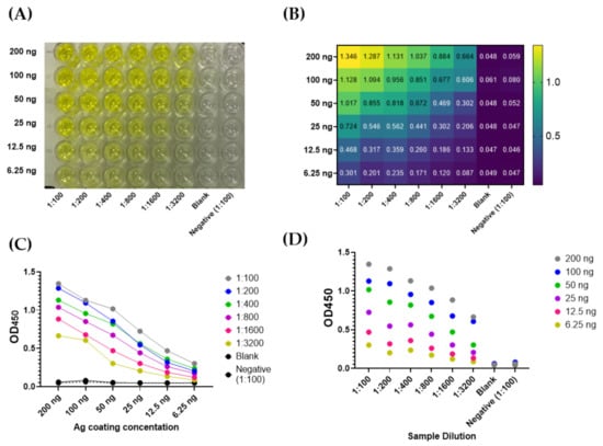 Optimization of an indirect ELISA utilizing SARS-CoV-2 NP recombinant protein. The assay was conducted as described in Section 2.3. (A) A representative image of results obtained at a range of SARS-CoV-2 NP coating concentration (6.25 to 200 ng) and a positive sample dilution (1:100 to 1:3200). Negative control and blank were also included. (B) Representative OD450 readings. (C,D) The effect of antigen (Ag) coating concentration and sample dilution on signal readings.