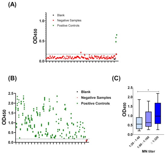The receiver-operating characteristic (ROC) was also utilized in order to define the threshold cut-off values that distinguish positive from negative with their corresponding sensitivity and specificity. The correlation between the OD450 values and MN titer was assessed by one-way ANOVA with a p value < 0.05 considered statistically significant.